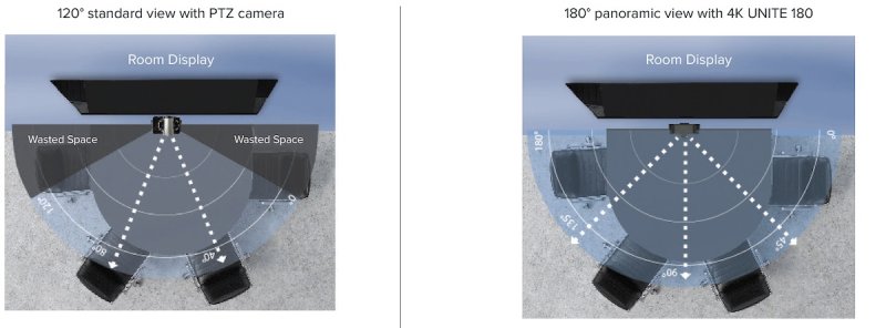 Unite 180 ePTZ kamera 180 graders vid vinkel (panorama view) 180 graders panoramaudsigt over store rum ved at sammensætte flere linser sammen som et komplet billede.