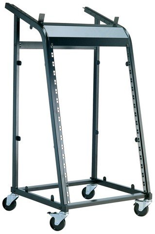 19" rack-vagn, svetsad stålkonstruktion med 4 hjul. 7 platser i toppsektionen, 16 i frontsektionen. Låsmuttrar inkluderade. Extra paneler är tillgängliga.