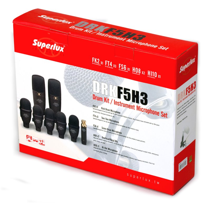 Superlux DRKF5H3 er et professionelt trommesæt med mikrofoner, bestående af otte instrumentmikrofoner. Hver mikrofon er designet specielt til sin tilsigtede brug med særligt fokus på polært mønster, frekvensrespons og lydtryk. Disse mikrofoner er velegnede til forskellige instrumenter og er ideelle til scene- og studiebrug. Sættet indeholder følgende mikrofoner: