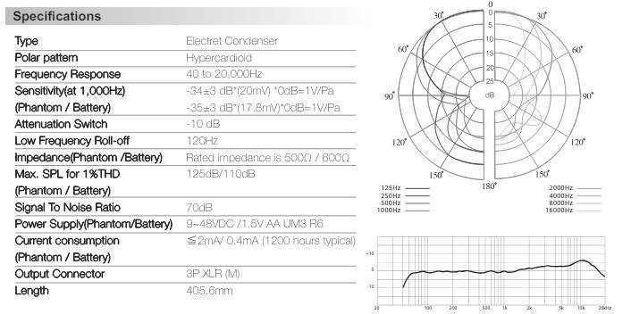 Total längd på 38 cm med ett extremt smalt, mycket riktat upptagningsmönster