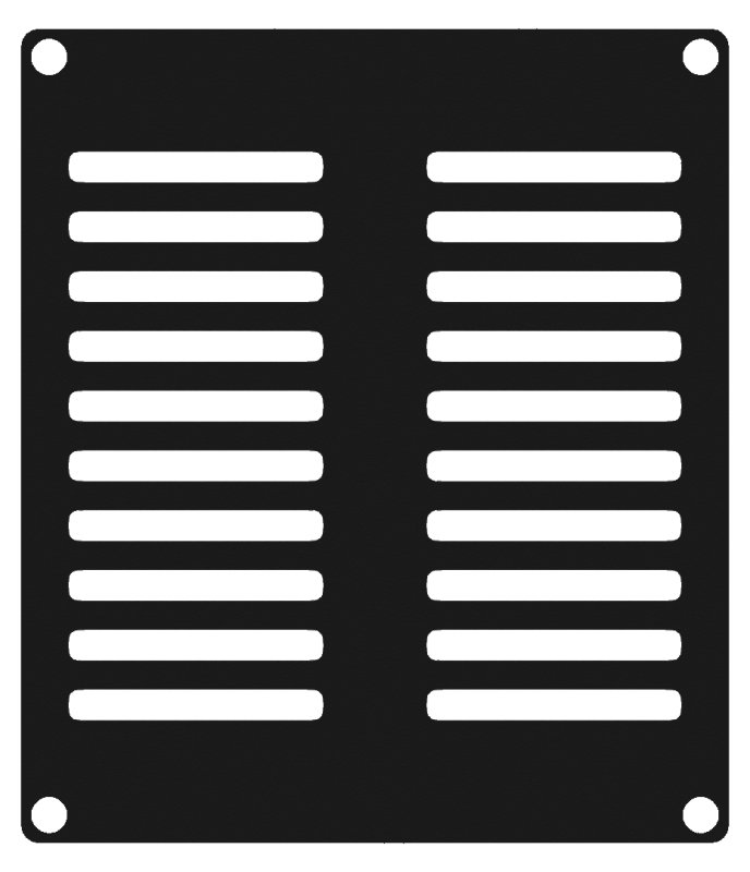 CASY202 är en ventileret blændplade med en 1,5 mm tjock stålkonstruktion och en strukturerad, svart pulverbeläggning.