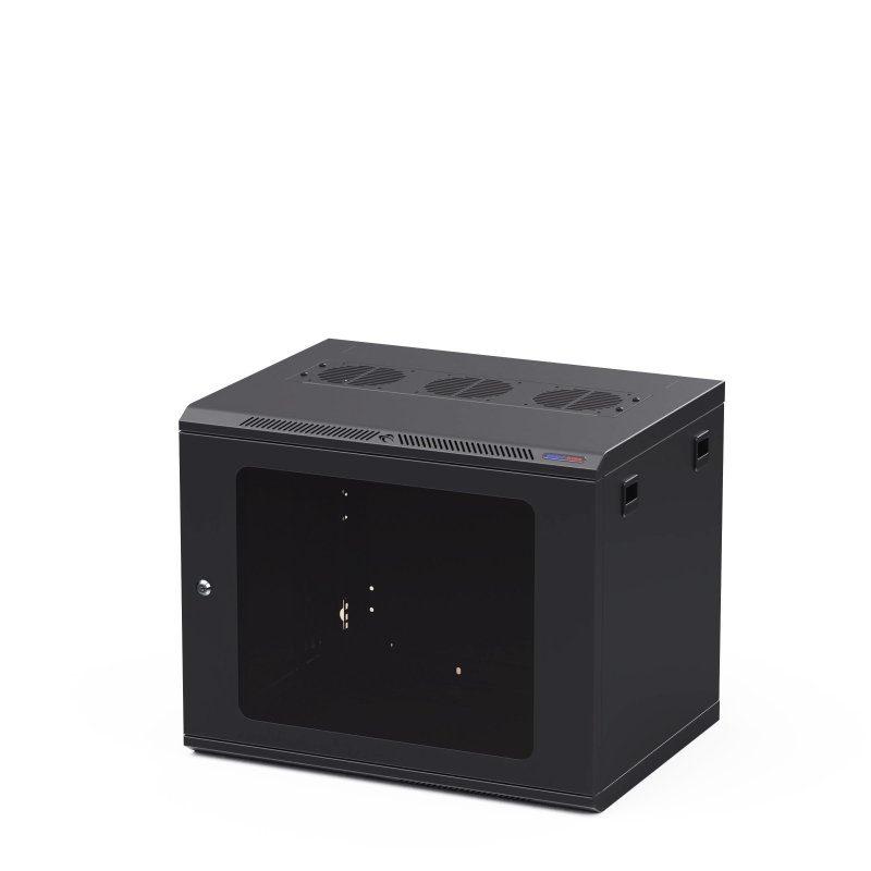 450 mm dybt 9U high-end sort vægmonteret rackskab med M6 gevindskinner og polykarbonat låsbar frontlåge.