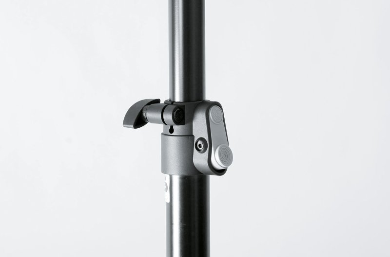 Två bärvänliga högtalarstativ, tillverkade av högkvalitativt aluminium, i en bärväska. Glasfiberförstärkta armaturer och en kompakt klämma, med ett patenterat tryckknappssystem, erbjuder användarvänlig höjdjustering och säkerställer stabilt stöd för högtalarna. Benkonstruktionen kan justeras med den användarvänliga klämarmen.