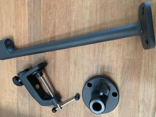 Der medfølger 3 beslag; Bordklemme, kort bordbeslag og lang bordbeslag.