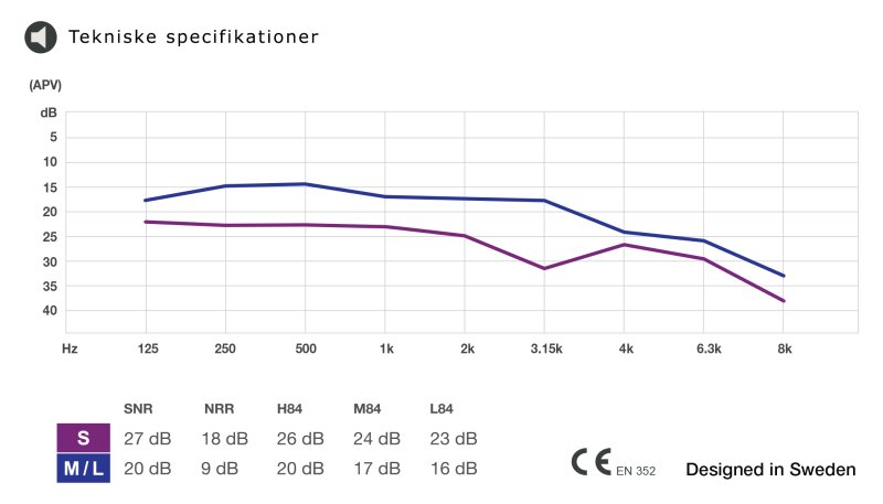 Gennemsnitlig dæmpning = 27dB for SMALL size