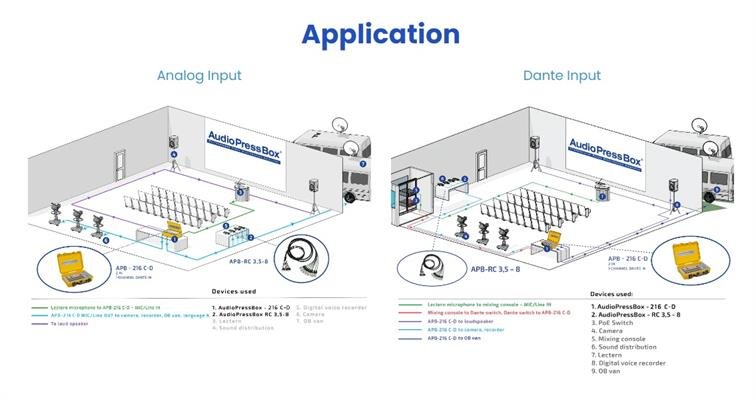Professionel bærbar, aktiv, Dante-kompatibel pressbox med 2 Line/Mic & 1 ch Dante-inputs og 16 Line/Mic outputs. Den er velegnet til både indendørs og udendørs pressemøder takket være det indbyggede genopladelige akku-pack og Nanuk-kassen i kraftigt design.